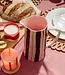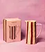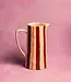 Mooie karaf gemaakt van keramiek in de zachte kleur lichtroze, geaccentueerd met diepe bordeauxrode strepen en een met de hand geschilderd okerkleurig detail.